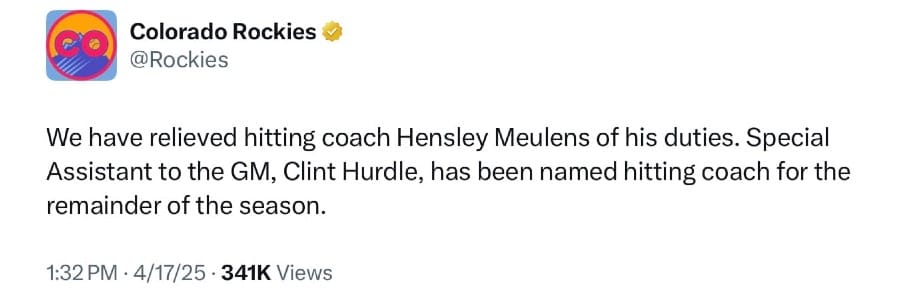 There had to be a change — Look, the Rockies’ record is 3-15, the worst in MLB. Moreover, their lack of offense had become a punchline. Just practically speaking, the Rockies needed a jolt to the system, and changing their hitting coach was one way to do that. (Whether it works is a different question, but it indicates a desire to at least try something different.)