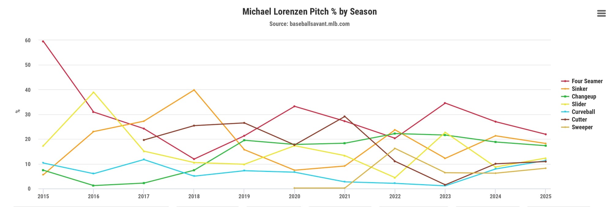 Lorenzen comes to the Rockies with a seven-pitch mix, one of the deepest in MLB. According to Baseball Savant, he throws a four-seamer (21.9%), sinker (18.2%), changeup (17.3%), slider (12.3%), curveball (11.3%), cutter (10.9%), and sweeper (8.2%).