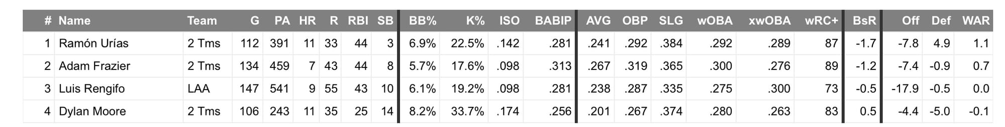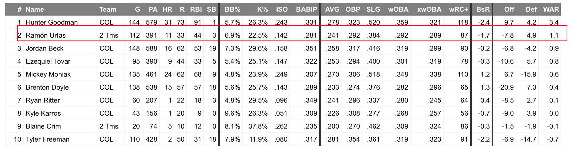 Only Tyler Freeman had a lower K%, and he would have been one of the better defenders. Most of Urías’ value comes from his defense, which would be of little help to a struggling Rockies offense.