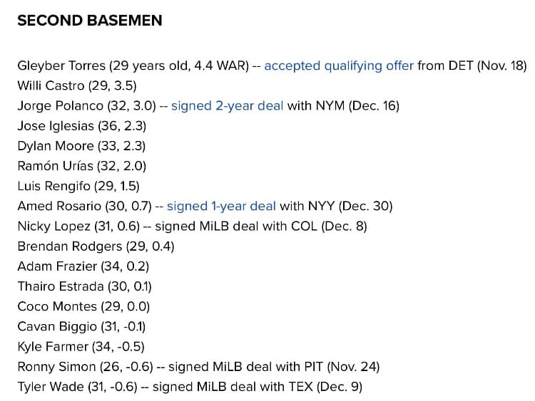 My methodology is not sophisticated. I started with the list of available second base free agents, and then looked to see how many of them had experience playing other infield positions. MLB.com’s list is worth sharing.